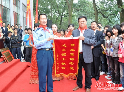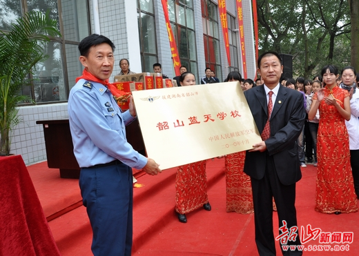 杨东明向韶山学校赠送“蓝天学校”牌匾。