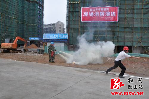 为了普及消防知识及操作技能,提高现场操作人员救火救灾、自防自救能力,有效遏制重大火灾事故发生,丰菊嘉苑多名施工人员组成了义务消防队员参加了消防安全演练。演练过程中,门卫值班人员发现火情后,急忙打电话向管理人员报告,管理人员马上启动《消防安全应急救援预案》,立即吹响哨声,召集义务消防队员参加灭火,义务消防队员同时使用干粉灭火器和消防用水灭火,最后火情得到及时扑灭。从门卫发现火情开始,到义务消防队员扑灭火堆为止,整个过程只有短短的两分钟。