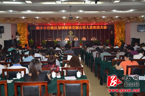 首先,湘乡市委常委、组织部长、统战部长郭兰主持湘乡市行政区划调整移交韶山市人员欢送大会,欢送182位在职工作人员和57名退休人员。湘乡市委常委、常务副市长成秋兴在讲话中向大家提出了三点希望,他说,希望大家在新的岗位以高度的责任感、使命感投身韶山的建设,同时以严密的组织纪律服从组织安排,以谦虚的工作态度服务好人民群众。