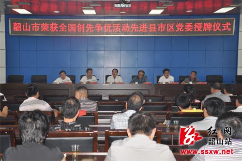 韶山新闻网讯(记者 刘东)日前召开的全国创先争优活动表彰大会上,韶山市荣获全国创先争优活动先进县市区党委光荣称号。10日上午,湘潭市委常委、组织部长、统战部长彭雁峰专程来到韶山,为韶山授牌。