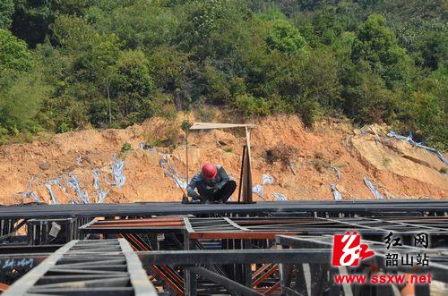 太阳火辣辣地烘烤着大地,工人师傅们也想着各种各样的办法避暑,大部分工人着着长衣长裤避免太阳直射,有的拿湿毛巾搭在脖子上,有焊工在钢架上搭着自制的“遮阳棚”,而有的工人却光着膀子在干活,身上晒得黝黑……汗滴顺着他们的额头不断流下,滴在地上,瞬间被蒸发得无影无踪。